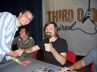 For Brad's birthday which was April 4th, (happy birthday honey!) I bought him 3rd Day tickets for the Revelation Tour Concert. He really admires Mac Powell, the lead singer, and hopes to one day sing just like him. :) I bought him the VIP tickets which allowed us to go to the 'Meet and Greet' before the concert, gave him a free CD, and let us sit on the 4th Row!